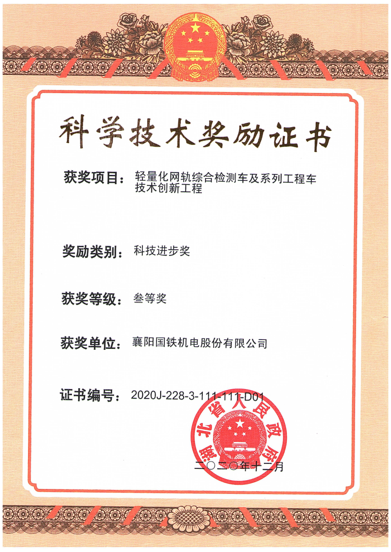 湖北省科技進(jìn)步三等獎 輕量化網(wǎng)軌綜合檢測車及系列工程車技術(shù)創(chuàng)新工程