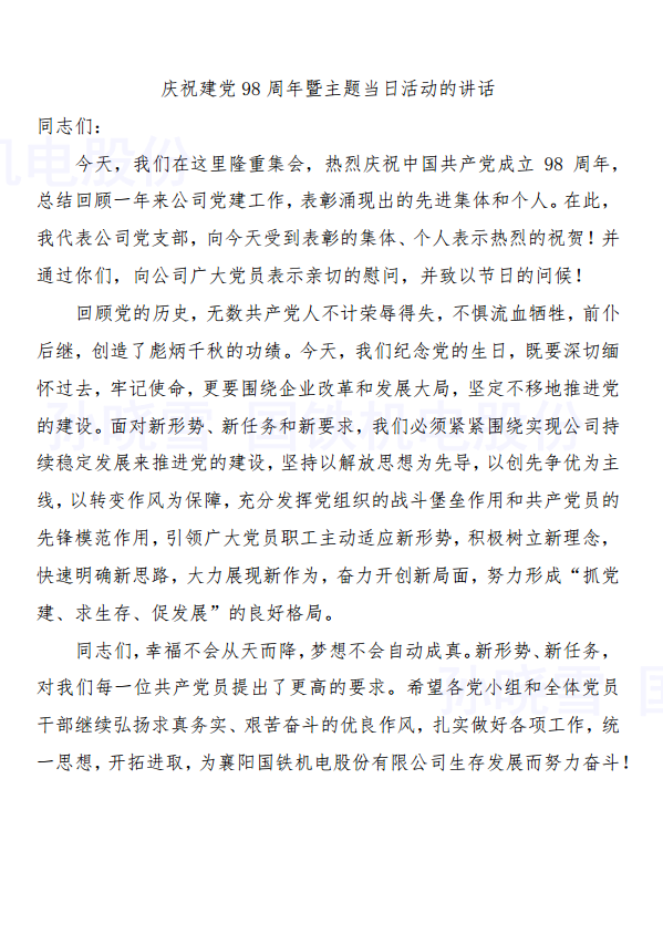 今年是建黨98周年。7月1日,襄陽國鐵機電股份有限公司以傳承紅色基因、弘揚革命精神展開了紀念活動。