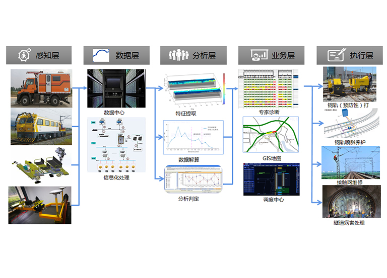 源自不同的智能檢測(cè)裝備的數(shù)據(jù)經(jīng)過(guò)數(shù)據(jù)中心整理、歸并、解算,生成過(guò)程性分析數(shù)據(jù)和直觀的判斷結(jié)果,最終對(duì)線路狀況提供運(yùn)營(yíng)維保的建議和意見(jiàn)。