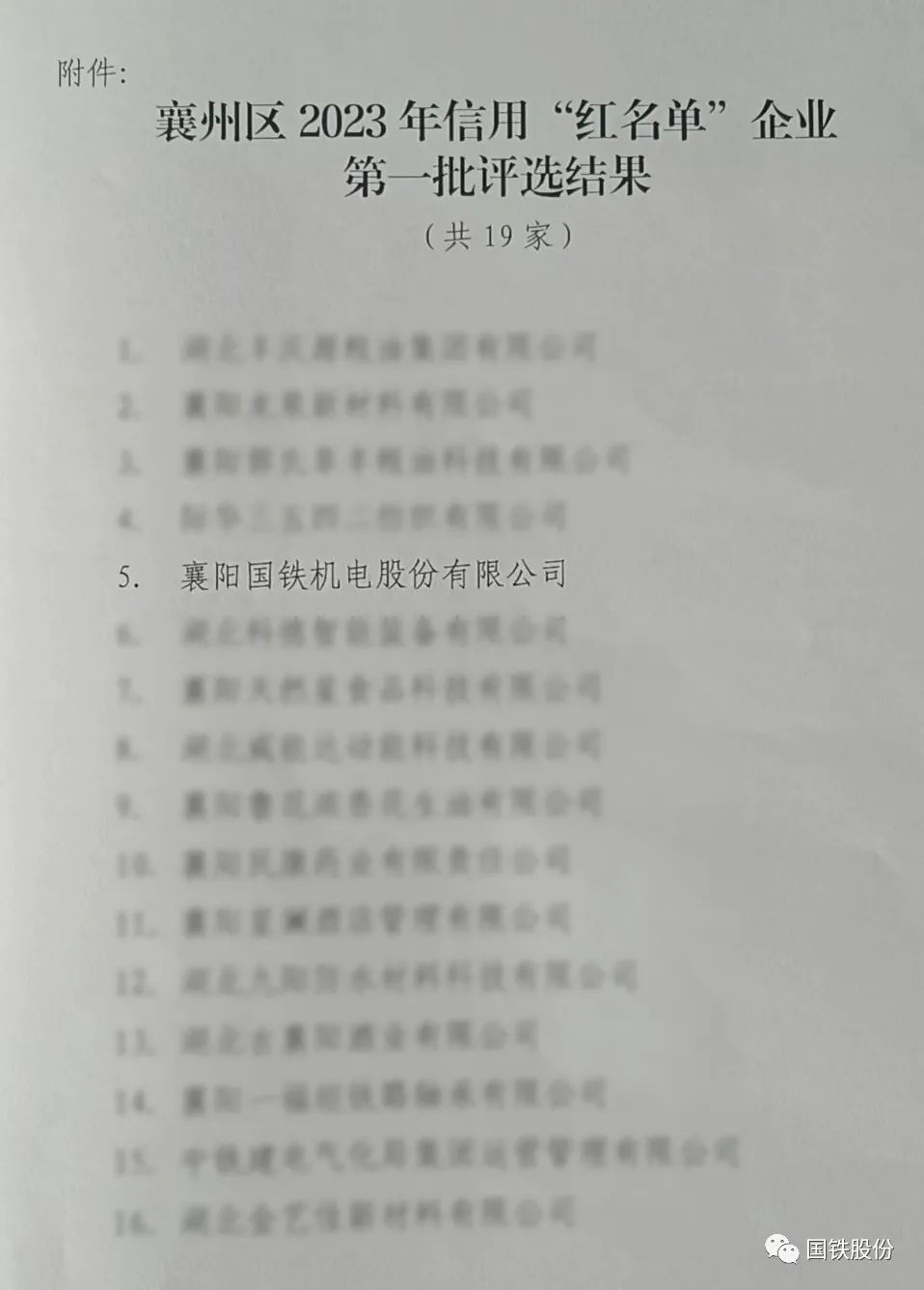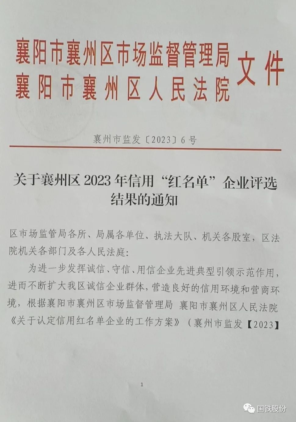 【喜報】國鐵機電獲“襄州區(qū)2023年信用‘紅名單’企業(yè)”榮譽